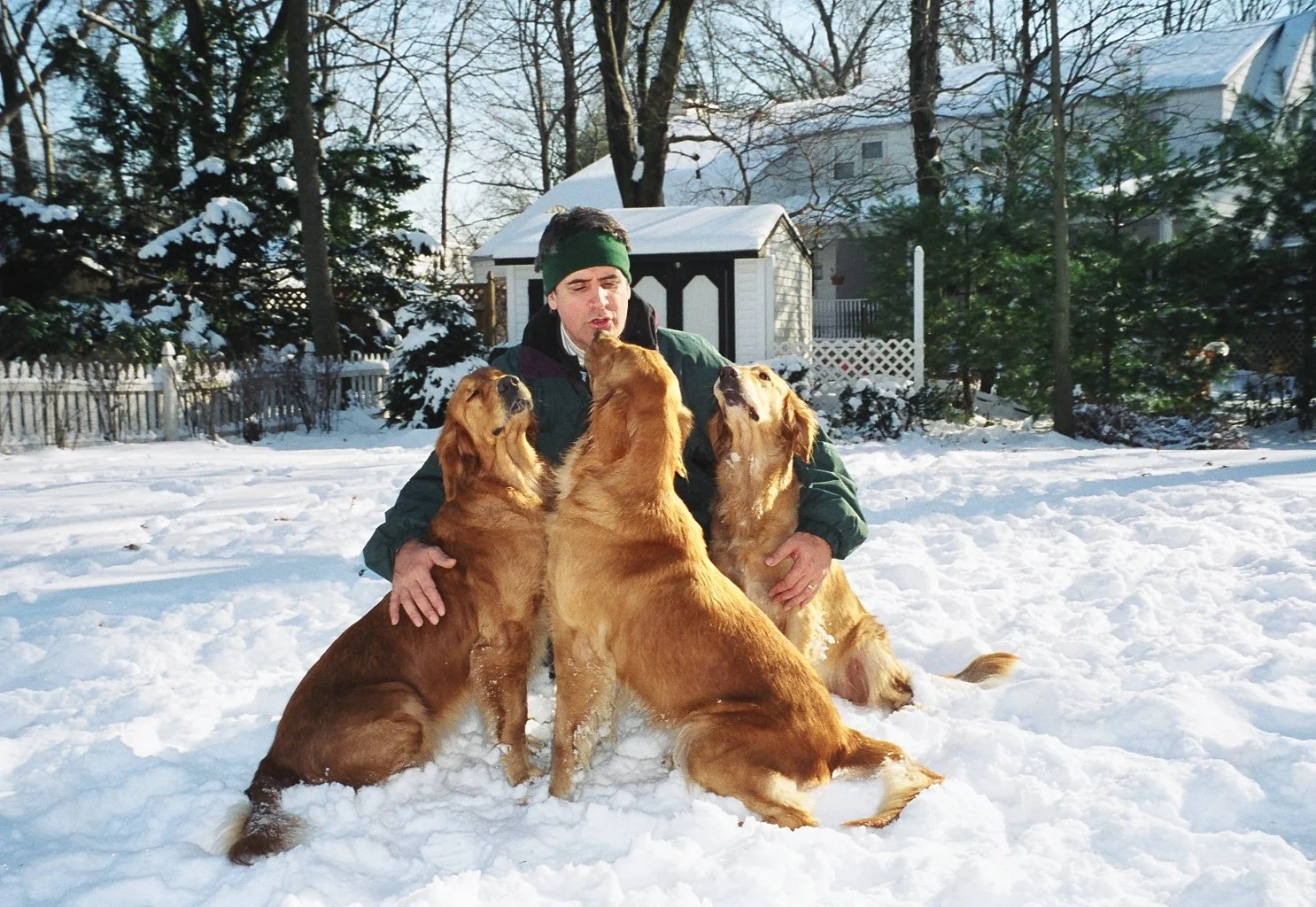 My dad & our 3 goldens Komet, Kupid, and Jordan
